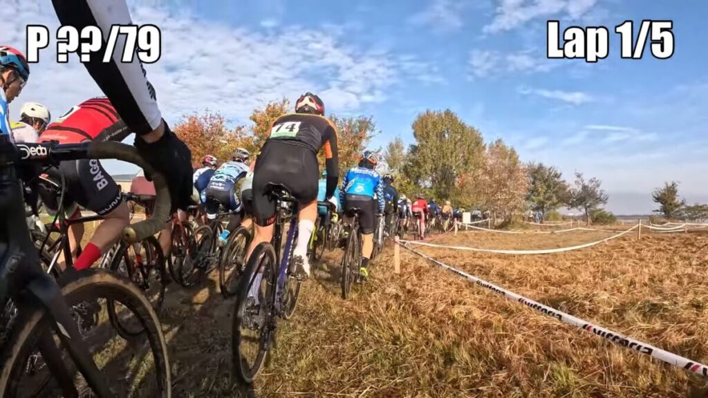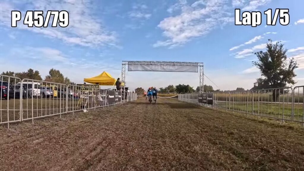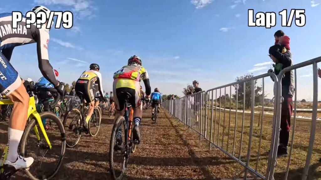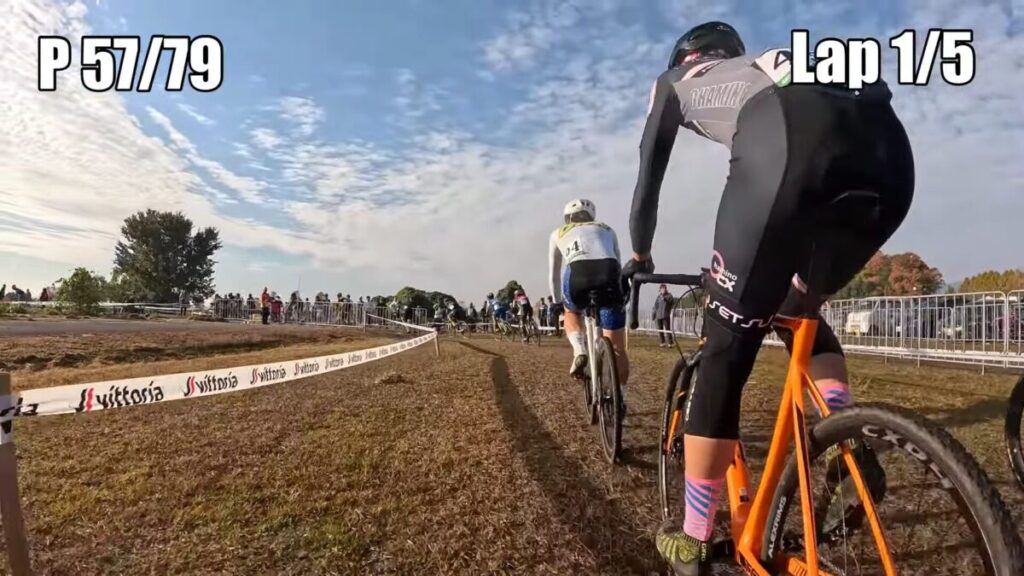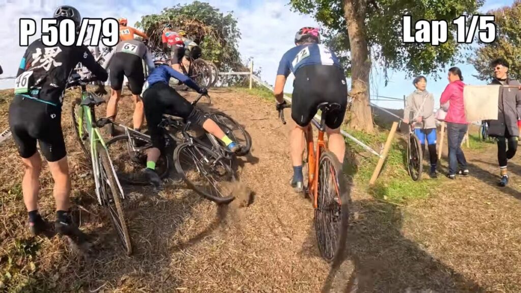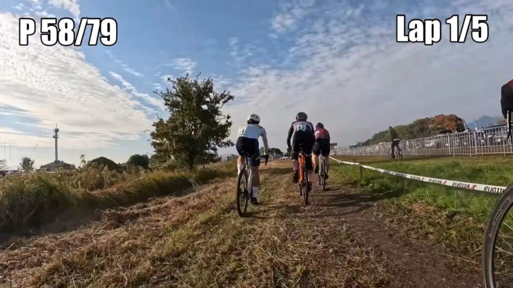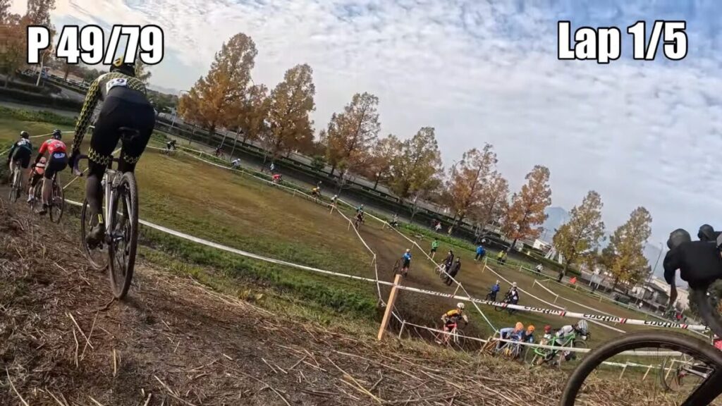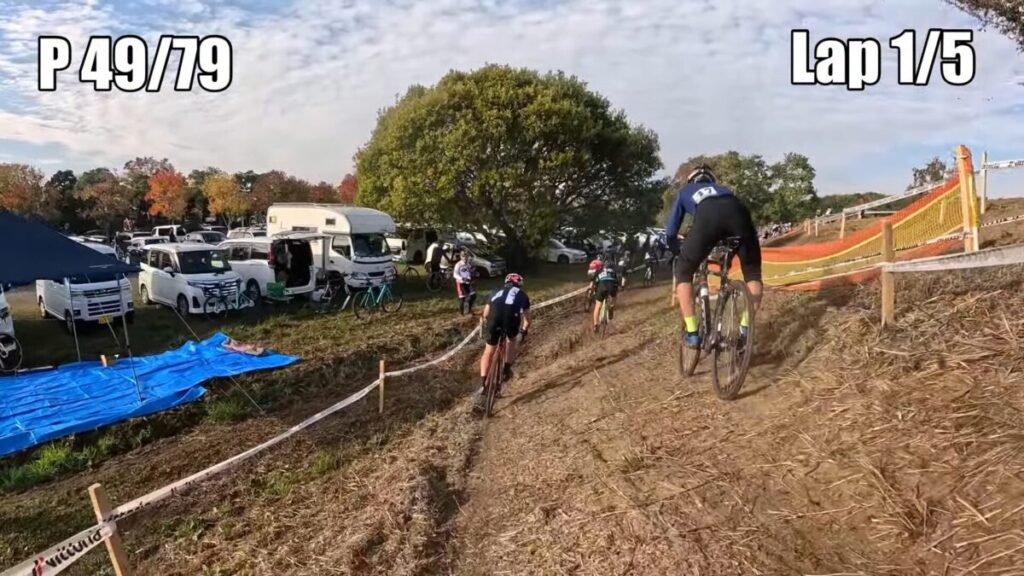 後から動画で確認すると、1つ目のキャンバーが終わった時点で63位。次のキャンバーまで、しばらく道幅の広い芝区間が続くので踏んでポジションアップを狙う。