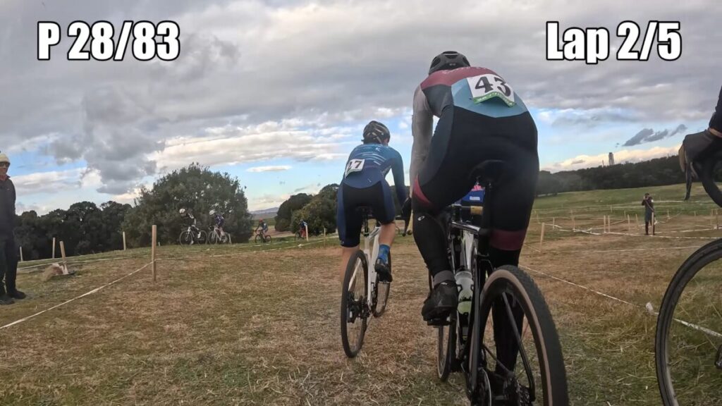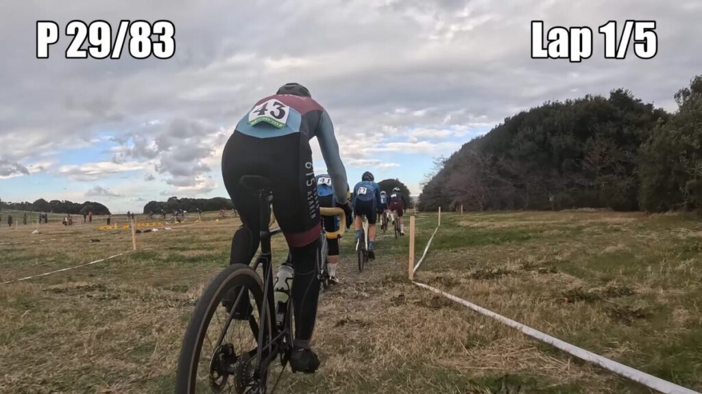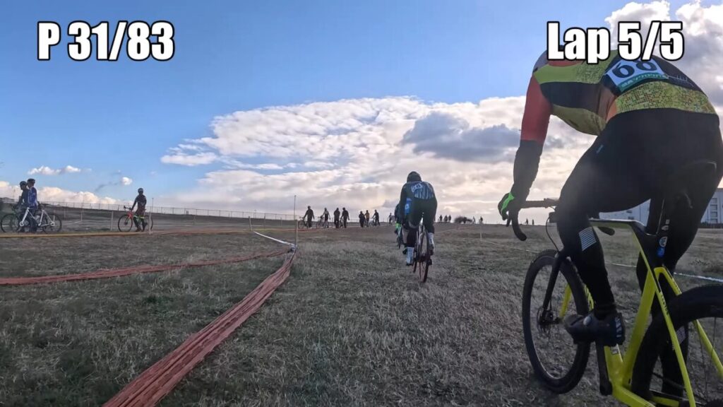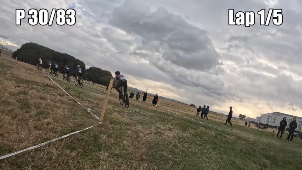 そんなこんなで、スタートから3分強で30番手付近、1周目は22番手パックで通過。レース中はわかってなかったけど、このまま最後までついていってスプリントで勝てれば、26%順位。良いところまできた!