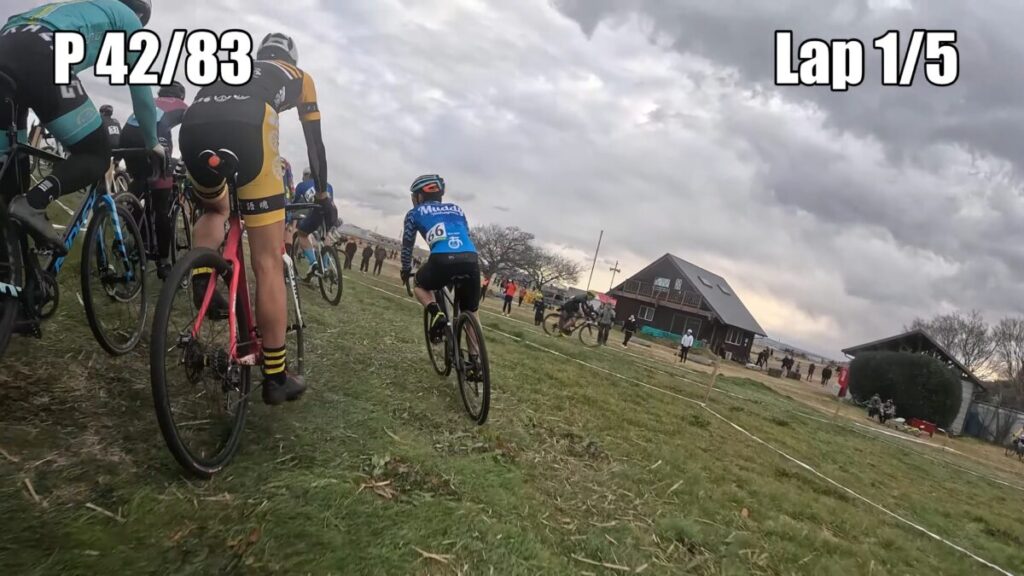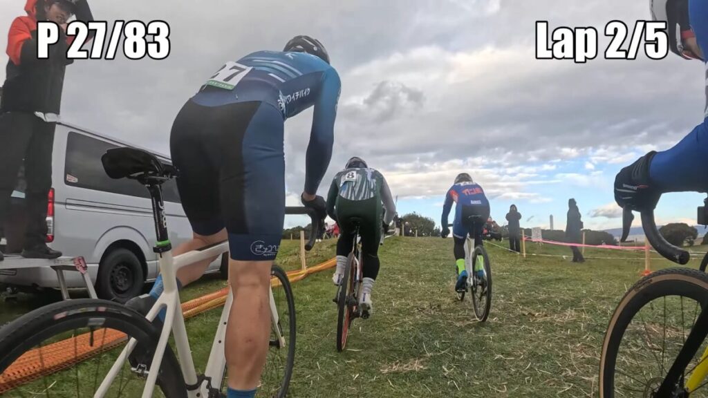 今回の関クロはフィジカルがモノを言うハイスピードコースってことで、順位を取る選手が違うっぽい。1周目から、どんどん若いゼッケン番号の選手が落ちてくる。対して、前に上がっていくのは、自分含めて番号が大きい選手。関クロは毎戦、特性が違って本当に楽しい。(砂コースは2つもいらないけど!)