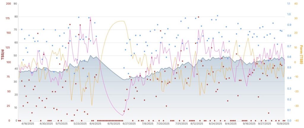 週末鈴鹿につき、トレーニングは3日のみ。可能な限り長めに乗ってボリューム稼いで、CTLマイナス1で留めた。