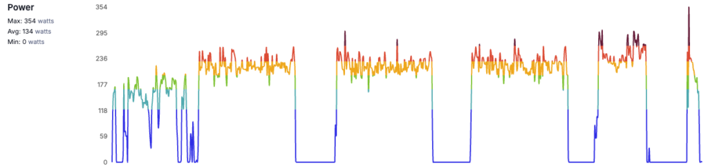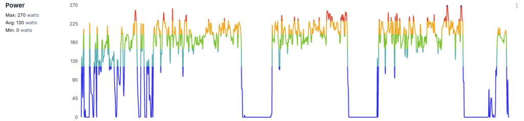 メインセット1つ目はFTP走。いつもの登りを3往復やって、南部コーチ指定のボリュームより多めに実施。心拍数的にも結構一杯一杯。ただ、M1上位行くなら4倍(240wぐらい)でこなさないとダメだよなぁ。鍛錬が足りん。