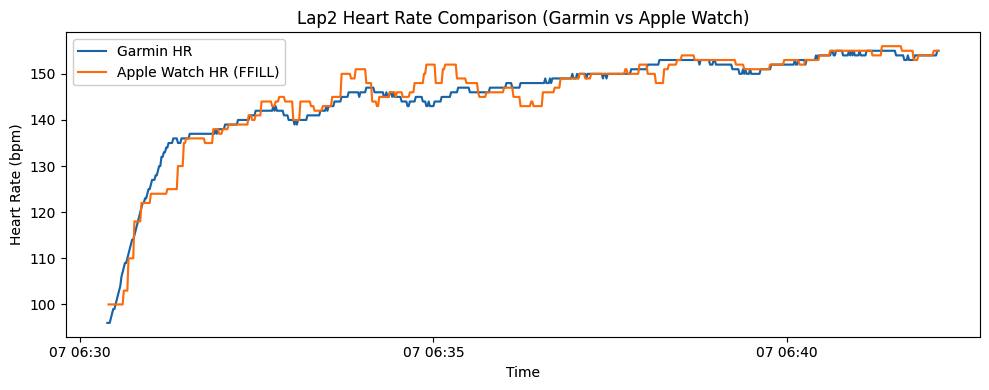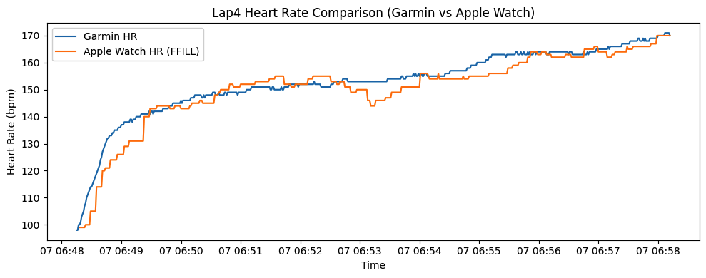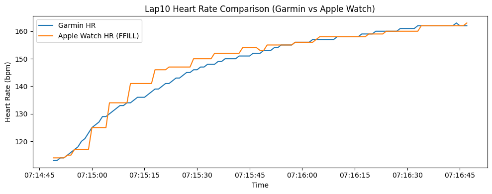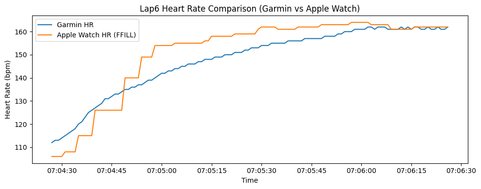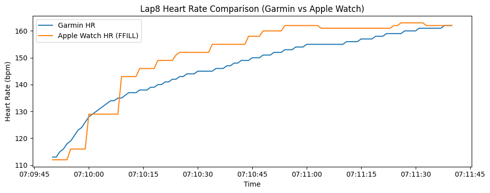 データを作っている中で発見したんだけど、ガーミンは1秒あたりの心拍数を記録するのに対して、アップルウォッチは2〜5秒に1回ぐらいのペースで数値を取得してる。その結果、グラフがアップルウォッチはかなり、カクカクになってる。(記録されていない秒は、直前の数値で埋めているため。)