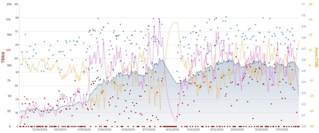 改めてPMCを確認すると、5月末のぎっくり腰休業期間が本当に勿体無い。ここで中強度をしっかり取り組めてたら、もうちょっとM1でも戦えたんじゃないかなって。オフシーズンの積み上げって本当に大事。カートとの両立でトレーニングボリュームを確保しづらい自分にとっては特に。