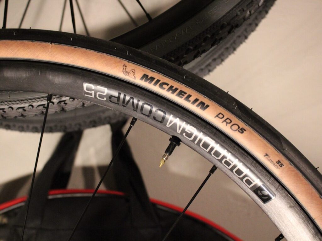 今時、ディスクブレーキ対応の17mmのナローリムって売ってる・・・?とかって考えると、ラインナップに33cはあるけど、31cが標準。って気がする。また、Vittoriaを使用する場合は、23mmを超えるリム幅のホイールはレースで使えなさそう。